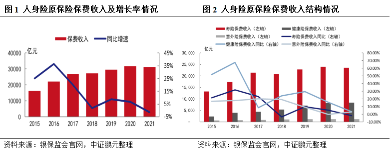 受監管政策持續加碼、壽險行業轉型、疫情沖擊、居民購買力下降等因素影響,近年來人身險原保險保費收入增速波動下滑,2021年首次呈現負增長。從結構來看,健康險保費收入保持增長但增速放緩,占總保費收入比重由2015年的14.80%增長至2021年的25.42%,產品結構持續調整,隨著居民健康保障意識的不斷提高,健康險保費收入規模及占比有望繼續提升。