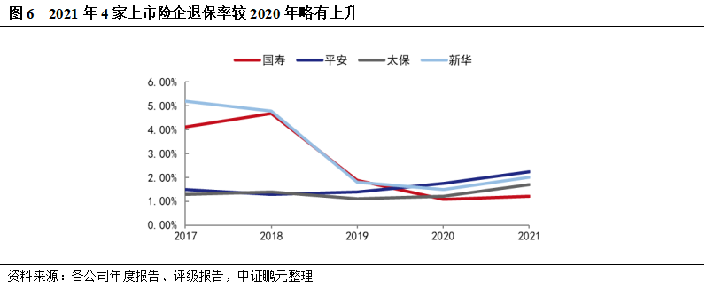 退保率方面,隨著中短存續期產品的逐步到期,2018年以來行業退保率整體呈下降趨勢,但2021年5家上市險企中有4家退保率較2020年略有上升。盡管近年來退保率整體下降,但仍面臨一定挑戰:代理人規模收縮,導致相關自保件退保;在居民理財方式持續多元化的沖擊下,儲蓄型產品的發展空間受到了一定擠壓;在“惠民保”等醫療險迅速發展的背景下,為減輕繳費壓力,部分長期險客戶選擇退長保短,都將為各險企帶來一定的退保壓力。整體來看,未來各險企退保率變化情況仍需關注。