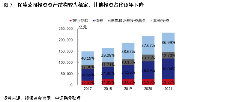近年來保險行業資金運用余額保持增長,投資端政策松綁,未來可投資領域擴大。受益于保費收入積累,保險行業資金運用余額呈持續增長態勢,2021年保險行業資金運用余額為23.23萬億元,同比增長7.14%。2021年中國銀保監會發布多項文件,允許符合要求的保險資金參與證券出借業務,投資公開募集基礎設施證券投資基金,取消保險資金可投金融企業(公司)債券白名單要求以及外部信用評級要求等,保險資金可投資范圍擴大,有利于保險資金的市場化運作,同時保險公司的信用風險管理能力也將面臨更大的考驗。