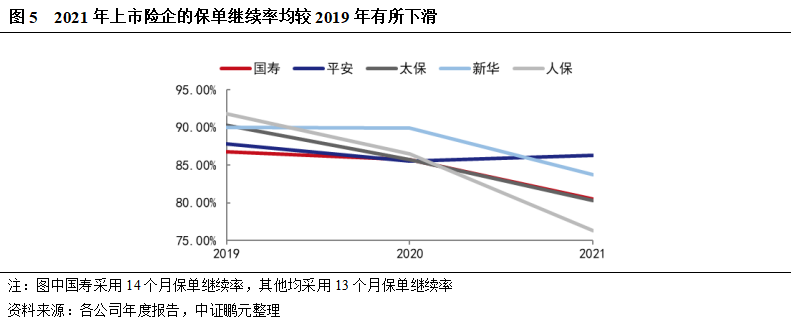 保單繼續率持續下滑,未來續期保費對保費增長的拉動作用有待觀察。從保單繼續率看,2021年5家上市險企的保單繼續率均較2019年有所下滑,在壽險行業轉型調整的背景下,代理人渠道改革的推進使得低質量代理人脫落,與之對應的存量保單也會受到影響,疊加疫情影響,代理人線下面訪受限,部分客戶因經濟問題未續保,拉低了保單繼續率。2022年代理人渠道改革仍在繼續,疫情尚未得到完全控制,續期保費對保費增長的支撐作用有待觀察。