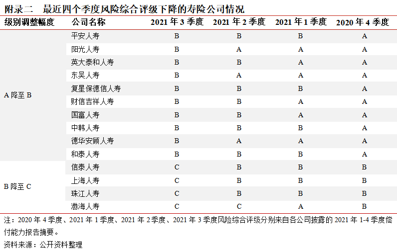 截至2021年三季度末,共有6家壽險公司風險綜合評級為C類,分別為前海人壽、信泰人壽、合眾人壽、上海人壽、渤海人壽和珠江人壽,其中前海人壽、合眾人壽風險綜合評級連續4個季度為C類。據中證鵬元統計,最近一期風險綜合評級較2020年四季度出現下降的壽險公司共14家,其中10家的風險綜合評級由A降至B,4家的風險綜合評級由B降至C;上升的共9家,其中小康人壽風險綜合評級由D上升至B,主要受益于引入新股東并增加注冊資本28億元,其他均為由B上升為A,具體見附錄二。風險綜合評級為C類或D類的公司,主要風險來自公司治理、資金運用、操作風險等方面,償付能力不達標將對保險公司后續保險、投資等多項業務的開展造成較大負面影響。