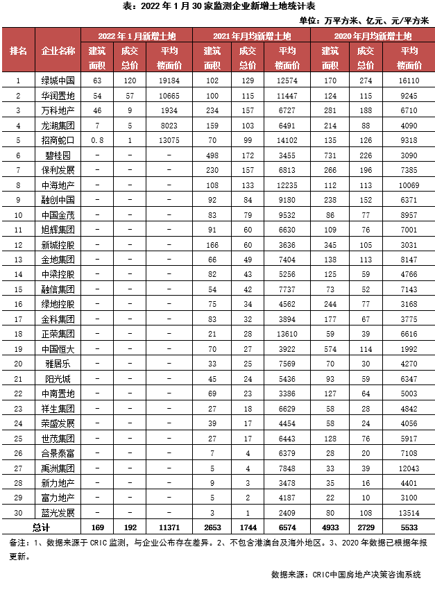2022年開年首月,30家監(jiān)測房企土地投資處于低位,新增土地成交建面、總價相比2021年及2020年年均都有大幅收窄,受投資結(jié)構(gòu)等影響,平均樓板價11371元/平方米。本月30家典型房企新增土儲總建面169萬平方米,環(huán)比下降87%;新增土地成交價格192億元,環(huán)比下降83%。平均樓板價11371元/平方米,與上月相比上升30%。主要由于投資量少且相對集中,拉高整體平均樓板價。