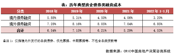 融資成本:2022年1月100家典型房企新增債券類1融資成本4.53%,較2021年全年下降下降0.76pct,其中境外債券融資成本達6.85%,下降0.19pct,境內(nèi)債券融資成本3.20%,下降0.87 pct。環(huán)比2021年12月來看,總?cè)谫Y成本環(huán)比上升0.01pct,境外融資成本環(huán)比下降0.16pct,境內(nèi)融資成本環(huán)比下降0.53pct。境內(nèi)發(fā)債的企業(yè)中,可以進行發(fā)債的企業(yè)成本相對較低,融資利率在2.50%-4.00%間,白名單企業(yè)繼續(xù)發(fā)揮融資優(yōu)勢,繼續(xù)發(fā)行利率較低的債券;境外發(fā)債成本方面,旭輝、遠洋等發(fā)行了綠色擔保票據(jù),其成本不超過5%,也相對較低,還有部分企業(yè)完成了境外債的交換要約和額外發(fā)行,成本相對較高。