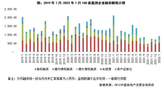 融資總量:2022年1月100家典型房企的融資總量為929.46億元,環(huán)比上升26%,同比下降56%。自2019年以來,每年年初房企融資量都相對較大,均超過2000億元,而本月融資量不足千億元,一方面在當前房企危機仍未全面解除的情況下,金融機構(gòu)當前白名單企業(yè)相對較少,放款較為謹慎;另一方面,部分企業(yè)為緩解年初的償債壓力已提前償還部分債券,同時減少新增融資計劃,導致融資量同比下滑較大。從融資結(jié)構(gòu)來看,境內(nèi)債權融資499.08億元,環(huán)比上升9.8%,同比下降24.6%;境外債權融資169.66億元,環(huán)比上升10.0%,同比下降80.1%;本月資產(chǎn)證券化有所回升,融資223.01億元,環(huán)比上升97.9%,同比下降63.0%。