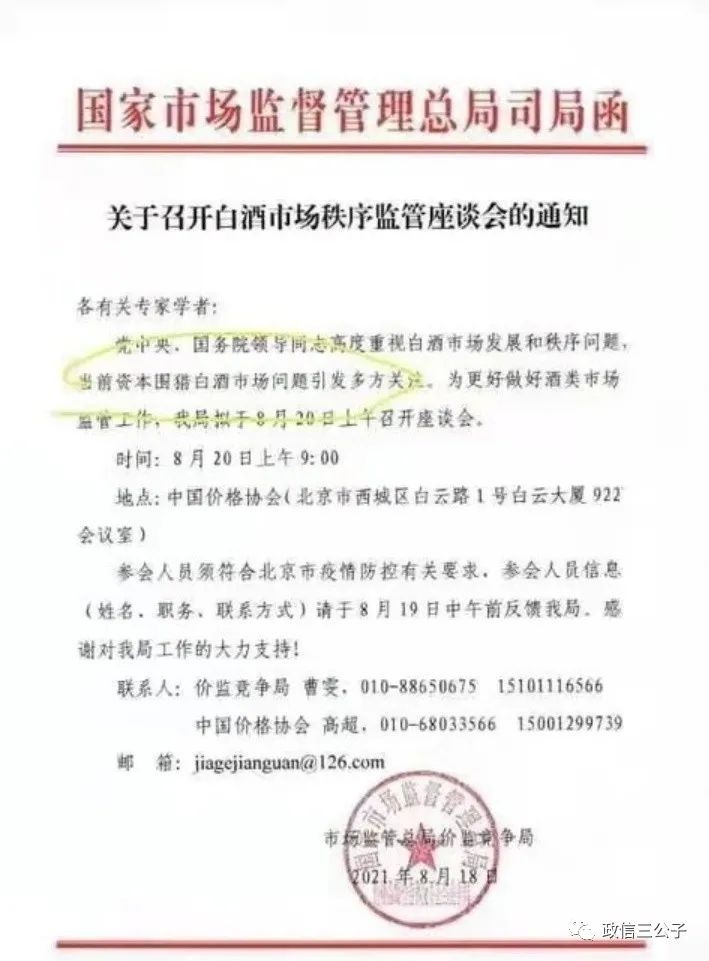 今天上午,市場流傳一份市場監管總局價監競爭局《關于召開白酒市場秩序監管座談會的通知》。里面提到: