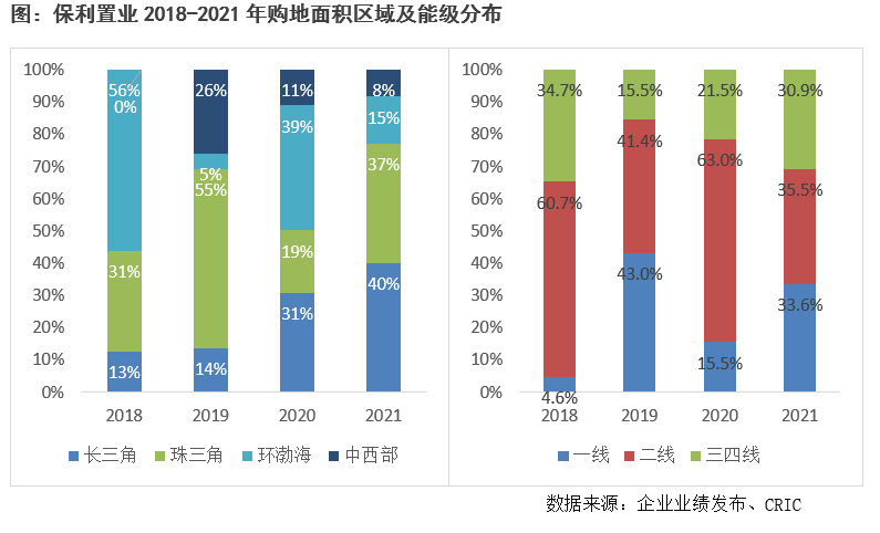 在城市能級方面,保利置業(yè)近兩年加大在三四線城市的布局,占比自2019年以來連年攀升,2021年占比達到30.9%,同比增長9.4個百分點,同時也加大在一線城市的布局,2021年一線城市的占比達到33.6%,同比上升18.1個百分點。而在區(qū)域布局方面,保利置業(yè)于長三角和珠三角區(qū)域拿地的建面占比最高,分別達到40%和37%,占比分別同比增長了9個百分點和18個百分點。