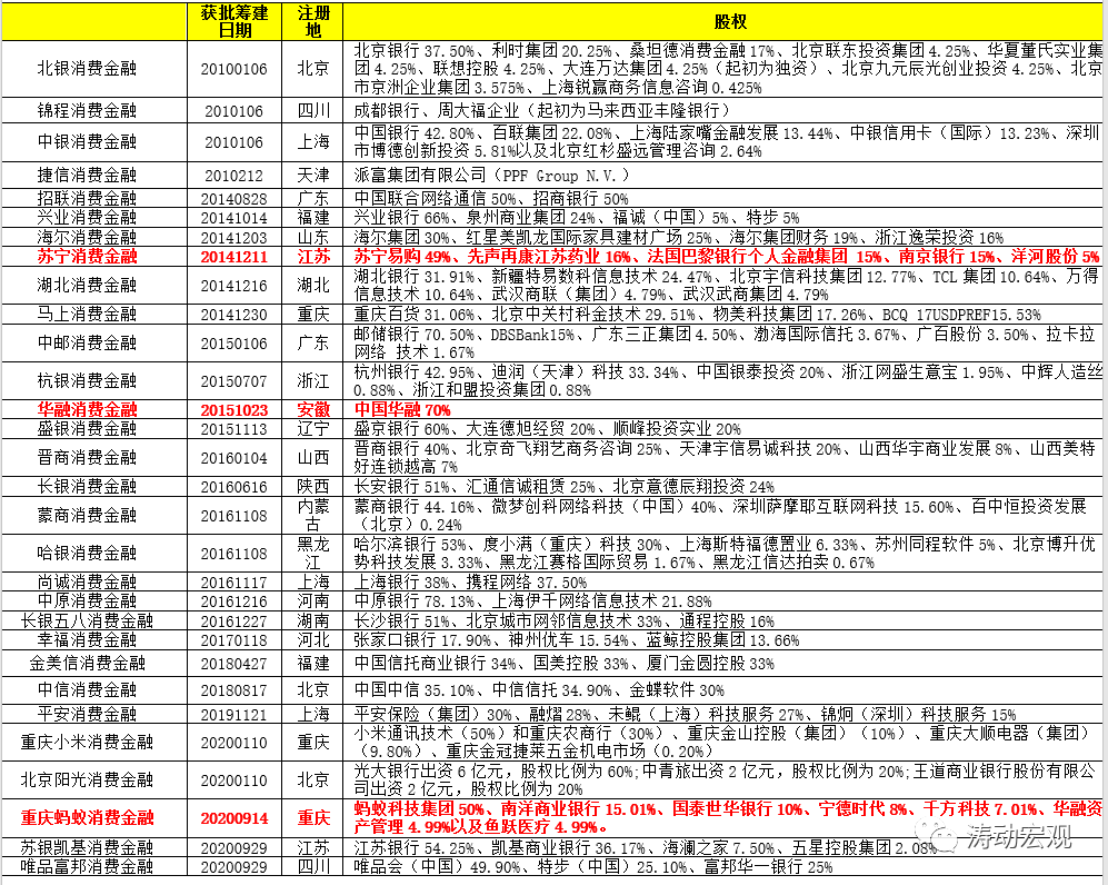 按批籌時間順序依次為北銀消費金融(北京銀行35.29%)、錦程消費金融(成都銀行38.86%)、蘇寧消費金融(南京銀行15%)、湖北消費金融(31.91%)、杭銀消費金融(杭州銀行41%)、盛銀消費(盛京銀行60%)、晉商消費金融(晉商銀行40%)、陜西長銀消費金融(長安銀行51%)、蒙商消費金融(蒙商銀行44.16%)、哈銀消費金融(哈爾濱銀行53%)、尚誠消費金融(上海銀行38%)、中原消費金融(中原銀行78.13%)、長銀五八消費金融(長沙銀行51%)、幸福消費金融(張家口銀行17.90%)、小米消費金融(重慶農商行30%)、蘇銀凱基消費金融(江蘇銀行50.10%)。這其中有一家地方性銀行為農商行,即重慶農商行。