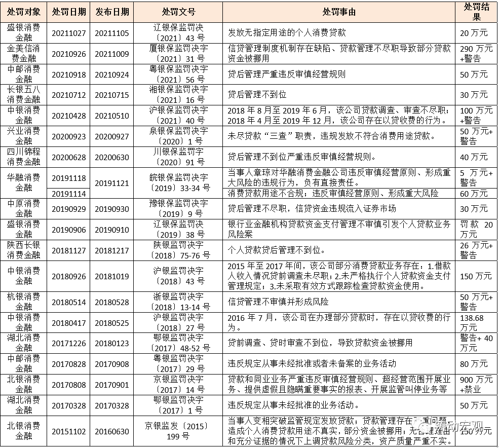 目前針對消費金融公司的監管處罰案例已比較多,處罰事由多為違反審慎經營規則、違反發放不符合用途的個人消費貸款等等。不過從處罰結果來看,超過100萬元的罰款案例并不多,因此在消費金融行業中,一旦處罰案例超過100萬元,則大概能說明該處罰和相應的違規問題算是比較重了。