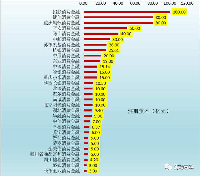 2、目前合計有9家消費金融公司的注冊資本超過20億元(含),依次為招聯消費金融(100億元)、捷信消費金融(80億元)、螞蟻消費金融(80億元)、平安消費金融(50億元)、馬上消費金融(40億元)、中郵消費金融(30億元)、蘇銀凱基消費金融(26億元)、杭銀消費金融(25.61億元)以及中原消費金融(20億元)。
