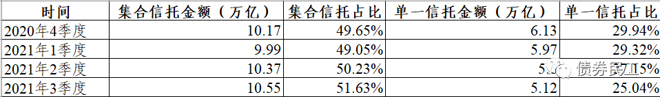 先來看第一組數據,截至2021年3季度末,集合資金信托規模為10.55萬億元,同比增長2.37%;單一資金信托規模為5.12萬億元,同比下降26.04%。從近年來整個信托產品的結構來看,集合信托產品的占比整體處于在提高,單一信托產品的占比則在下降。