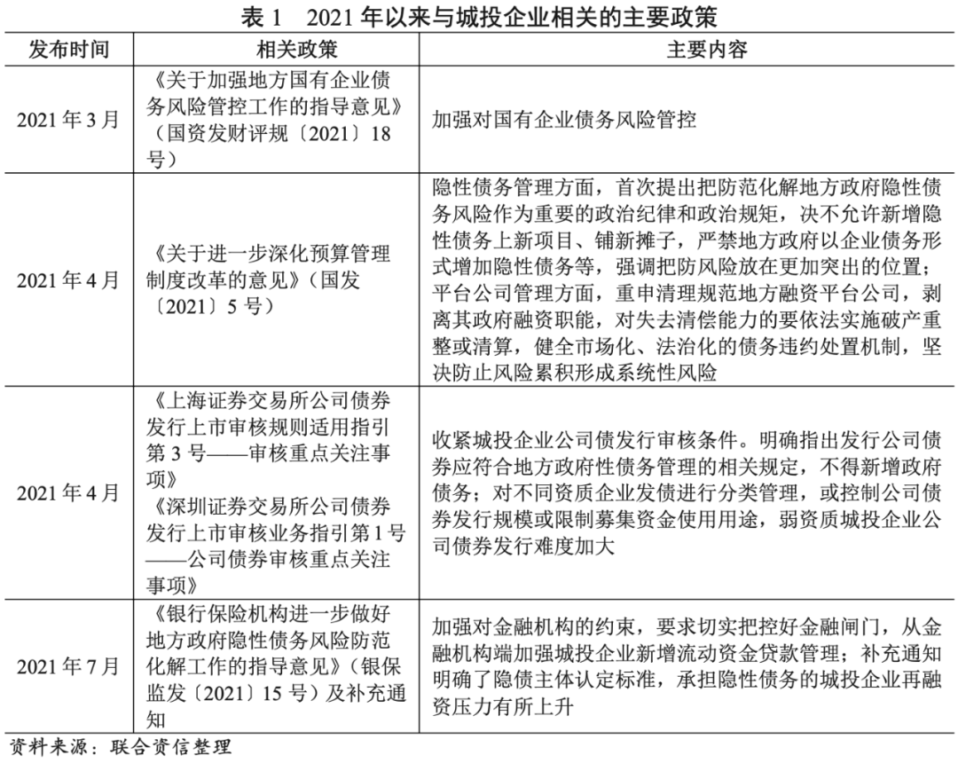 2021年以來,國(guó)發(fā)〔2021〕5號(hào)文、滬深交易所公司債發(fā)行上市審核指引、銀保監(jiān)發(fā)〔2021〕15號(hào)文及補(bǔ)充通知等政策相繼出臺(tái),對(duì)地方政府隱性債務(wù)保持高壓監(jiān)管態(tài)勢(shì),城投企業(yè)融資政策整體收緊。