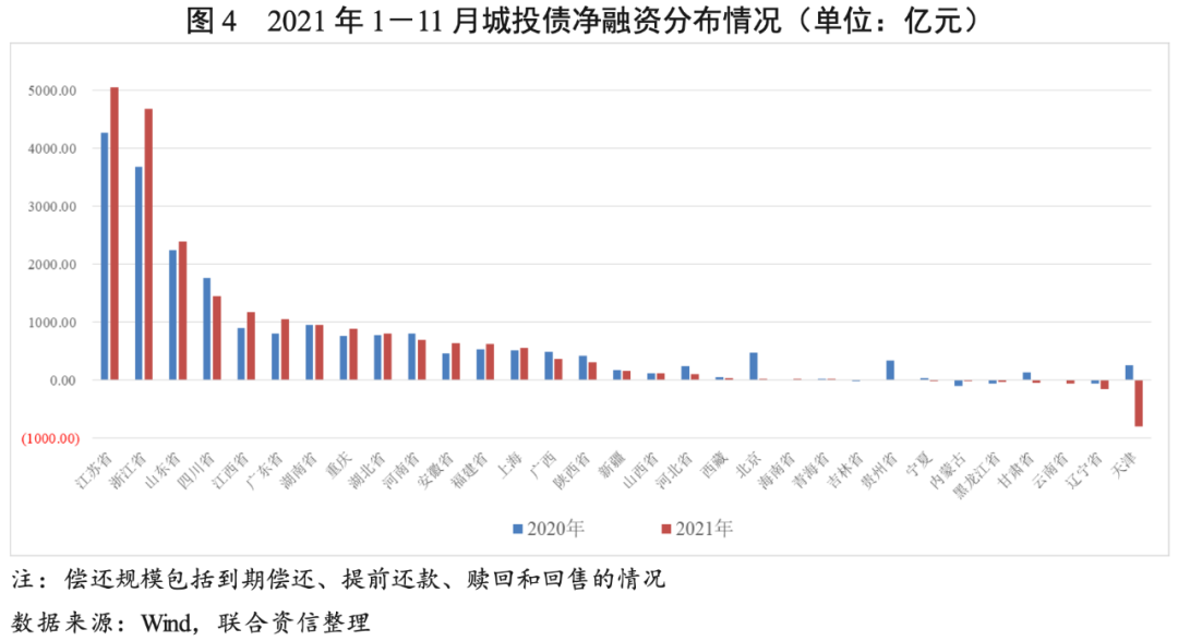 2021年1-11月,城投債償還規(guī)模同比擴(kuò)大,城投債凈融資20813.57億元,較上年同期的20837.49億元基本持平,但凈融資增速同比大幅下降。