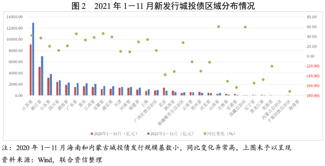 2021年以來,城投債發(fā)行規(guī)模保持增長(zhǎng)但增速回落。城投債發(fā)行的區(qū)域性分化持續(xù),江蘇、浙江及山東等省份城投債發(fā)行規(guī)模保持較快增長(zhǎng),東北和西部省份城投債發(fā)行規(guī)模降幅明顯。受交易所收緊公司債審核條件影響,公司債發(fā)行增速明顯回落,規(guī)模占比有所下降。