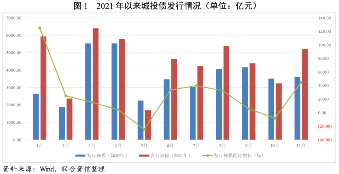 2021年以來,城投企業(yè)融資政策收緊,但市場(chǎng)流動(dòng)性仍保持整體寬松,同時(shí)產(chǎn)業(yè)類債券尤其是房企債券信用風(fēng)險(xiǎn)持續(xù)暴露,導(dǎo)致一級(jí)市場(chǎng)出現(xiàn)結(jié)構(gòu)性資產(chǎn)荒,綜合影響下,城投債發(fā)行規(guī)模持續(xù)增長(zhǎng)。2021年1-11月,發(fā)行城投債的主體數(shù)量同比增長(zhǎng)7.78%,城投債發(fā)行數(shù)量及發(fā)行規(guī)模同比分別增長(zhǎng)34.17%和24.12%,仍保持增長(zhǎng)態(tài)勢(shì),但增速較上年同期(74.15%和67.84%)均明顯回落。具體來看,除5月份和10月份城投債發(fā)行規(guī)模小于上年同期外,其他月份均高于上年同期水平。國(guó)發(fā)〔2021〕5號(hào)文及交易所公司債審核指引于4月份集中發(fā)布,嚴(yán)監(jiān)管下5月份城投債發(fā)行規(guī)模較上年同期下降24.61%;10月份,房企債務(wù)違約影響持續(xù)發(fā)酵疊加節(jié)假日因素,城投債發(fā)行規(guī)模較上年同期下降8.02%。