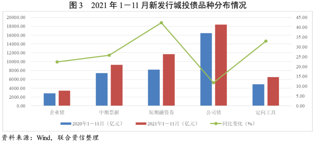 從發(fā)行品種來看,2021年1-11月,新發(fā)行城投債以公司債(占37.25%、)、短期融資券(占23.71%)和中期票據(jù)(占18.84%)為主,受滬深交易所收緊城投債發(fā)行審核條件影響,公司債發(fā)行規(guī)模占比較上年同期的41.36%下降4.11個(gè)百分點(diǎn),發(fā)行規(guī)模增速由上年同期的117.91%大幅回落至11.79%。短期融資券發(fā)行規(guī)模較上年同期繼續(xù)保持較快增長(zhǎng),發(fā)行規(guī)模占比較上年同期的20.68%提升3.03個(gè)百分點(diǎn),融資政策收緊引發(fā)市場(chǎng)對(duì)部分地區(qū)城投企業(yè)償債能力擔(dān)憂,風(fēng)險(xiǎn)偏好有所下降,對(duì)短期限產(chǎn)品更為青睞。