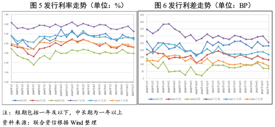 2021年以來,債券市場(chǎng)資金面表現(xiàn)為“先邊際收緊后逐步放松”。具體來看,2021年上半年,隨著國(guó)內(nèi)疫情形勢(shì)趨于穩(wěn)定,經(jīng)濟(jì)穩(wěn)步復(fù)蘇,債券市場(chǎng)資金面延續(xù)了2020年下半年以來邊際收緊的趨勢(shì);2021年下半年,隨著央行全面降準(zhǔn)以及下調(diào)金融機(jī)構(gòu)存款準(zhǔn)備金率等釋放流動(dòng)性,市場(chǎng)資金面趨緊態(tài)勢(shì)有所回暖。受市場(chǎng)流動(dòng)性變化的綜合影響,2021年1-11月,不同期限債券的發(fā)行利率和發(fā)行利差走勢(shì)呈現(xiàn)分化,短期城投債的發(fā)行利率和發(fā)行利差較2020年均有所上升,中長(zhǎng)期城投債的發(fā)行利率變化不大、發(fā)行利差均有所下降。不同地區(qū)城投債發(fā)行利差分化較為明顯。