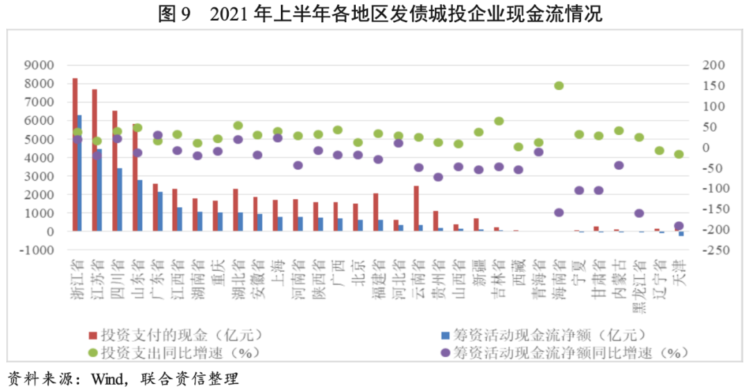 現(xiàn)金流方面,2018以來,城投企業(yè)投資支出增速保持較高水平,表明城投企業(yè)基礎(chǔ)設(shè)施建設(shè)整體投資力度逐年加大。但分區(qū)域來看,2020年,寧夏、青海、西藏、天津、黑龍江、內(nèi)蒙古等地城投企業(yè)投資支出同比有所下降,其他地區(qū)均呈現(xiàn)不同程度增長(zhǎng)態(tài)勢(shì);2021年上半年,除天津、遼寧外,其他地區(qū)城投企業(yè)投資支出同比均有所增長(zhǎng)。籌資活動(dòng)方面,2020年以來,天津、內(nèi)蒙古及黑龍江發(fā)債城投企業(yè)籌資活動(dòng)現(xiàn)金流持續(xù)表現(xiàn)為凈流出,依賴政府回款平衡現(xiàn)金流;2021年上半年,多數(shù)省市城投企業(yè)籌資活動(dòng)現(xiàn)金流凈額同比下降,天津、內(nèi)蒙古、甘肅、東三省及西南地區(qū)降幅明顯。2021年1-6月,發(fā)債城投企業(yè)投資支付的現(xiàn)金及籌資活動(dòng)現(xiàn)金流量?jī)纛~較上年同期分別增長(zhǎng)28.92%和下降9.85%,投資力度加大的同時(shí)凈融資規(guī)模收縮,城投企業(yè)資金壓力整體上升。