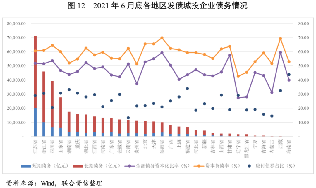 具體來看,截至2021年6月底,江蘇、浙江和四川發(fā)債城投企業(yè)有息債務(wù)規(guī)模位列前三,東三省、西北部省份及海南省發(fā)債城投企業(yè)債務(wù)規(guī)模較小。福建、湖南、西藏、重慶、山東及浙江等地應(yīng)付債券占比均超過30%,對(duì)債券融資的依賴度相對(duì)較大;隨著到期債券逐步償還,云南、內(nèi)蒙古、青海、黑龍江、甘肅、寧夏等地債券融資占比下降至較低水平。債務(wù)負(fù)擔(dān)方面,陜西、甘肅、天津和四川等發(fā)債城投企業(yè)債務(wù)負(fù)擔(dān)較重,遼寧、黑龍江、內(nèi)蒙古、貴州和海南發(fā)債城投企業(yè)債務(wù)率水平較低,但實(shí)際債務(wù)負(fù)擔(dān)需結(jié)合具體城投企業(yè)資產(chǎn)質(zhì)量進(jìn)行甄別分析。