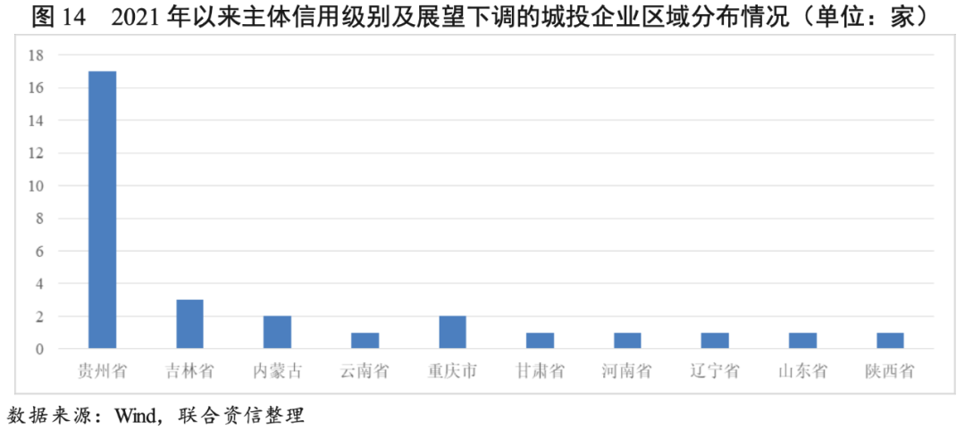 監(jiān)管趨嚴(yán)、融資政策收緊對(duì)政府債務(wù)負(fù)擔(dān)較重地區(qū)的弱資質(zhì)城投企業(yè)產(chǎn)生更大負(fù)面影響。2021年以來,主體信用等級(jí)及展望下調(diào)的城投企業(yè)數(shù)量明顯增加,包括主體信用等級(jí)下調(diào)10家,展望下調(diào)20家,下調(diào)原因主要包括區(qū)域經(jīng)濟(jì)及財(cái)力下滑,短期償付壓力大,出現(xiàn)欠息、代償以及非標(biāo)逾期等風(fēng)險(xiǎn)事件。其中,主體信用級(jí)別下調(diào)至AA-的主體居多,占50.00%;從地域分布看,貴州省主體信用級(jí)別及展望下調(diào)的城投企業(yè)最多(共計(jì)17家),其次為吉林省(共計(jì)3家)。