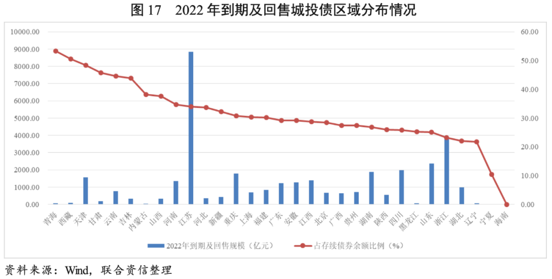 從存續(xù)城投債到期規(guī)模來看,假設(shè)含回售選擇權(quán)的債券全額回售,2022年城投債到期及回售規(guī)模合計(jì)35260.99億元,償債壓力明顯大于2021年(約27000億元)。從兌付時(shí)間分布來看,2022年3月、4月和8月城投債到期及回售規(guī)模超過3500億元,集中償付壓力較大。區(qū)域方面,需重點(diǎn)關(guān)注天津、甘肅、云南等地城投債兌付壓力,并重點(diǎn)關(guān)注短期償債壓力大及出現(xiàn)逾期、欠息、擔(dān)保代償、非標(biāo)逾期等負(fù)面事件尾部城投企業(yè)的信用風(fēng)險(xiǎn)。