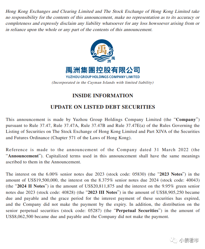 此外,禹洲集團(tuán)未兌付優(yōu)先永續(xù)證券806萬(wàn)美元的款項(xiàng),已構(gòu)成以上票據(jù)和證券下的違約事件。