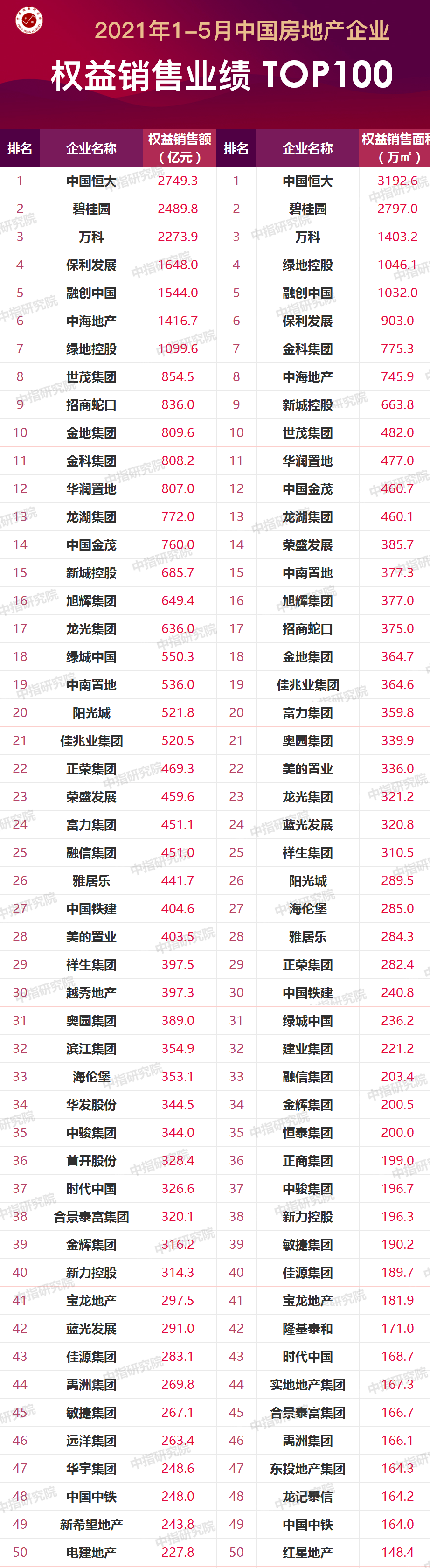 2)51-100位,起伏較大的太多了,恒泰集團、隆基泰和、紅星地產、鴻翔房產集團、實地、花樣年、景瑞控股、當代置業等,運氣似乎都不好。首創置業,似乎沒有首開股份那么厲害。俊發集團2021年前5月權益銷售額排名52位,如今66名。