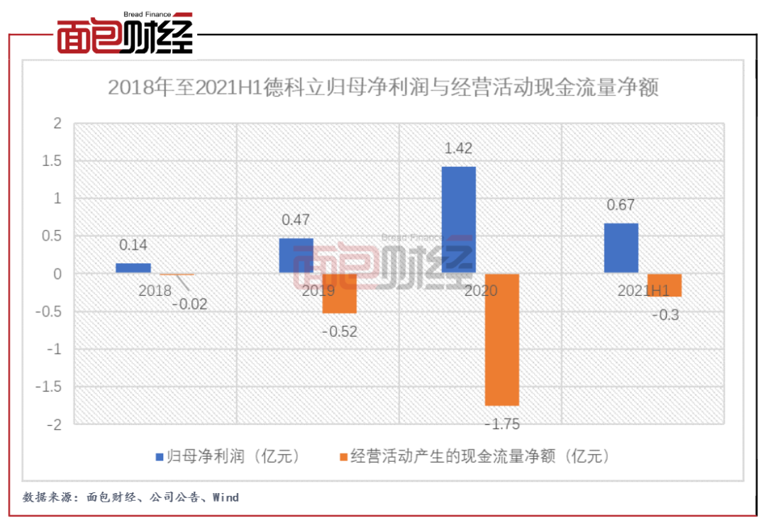 德科立近年來經(jīng)營活動產(chǎn)生的現(xiàn)金流量一直為凈流出狀態(tài)。2019年至2021年上半年,公司經(jīng)營活動產(chǎn)生的現(xiàn)金流量凈額分別為-0.52億元、-1.75億元、-0.3億元。