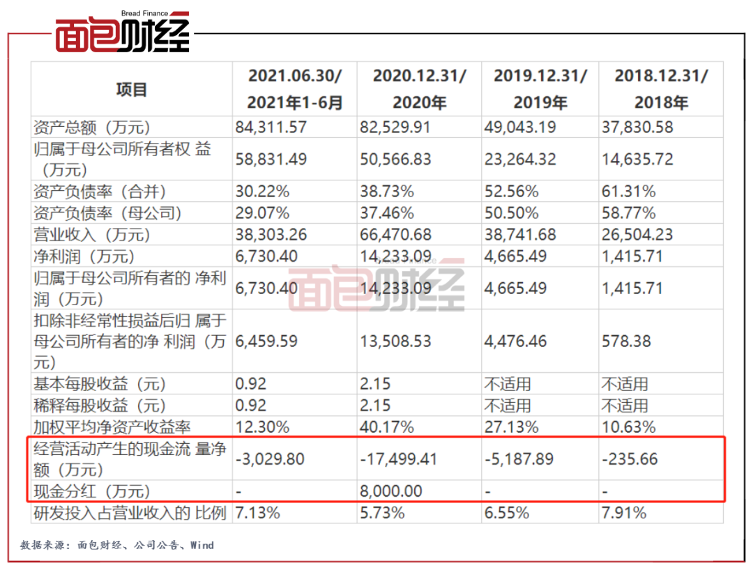 公司經(jīng)營活動產(chǎn)生的現(xiàn)金流量凈流出與應(yīng)收賬款和存貨的增加有關(guān)。2020年公司應(yīng)收賬款為1.34億元,較上年末增加逾80%,2021年上半年末進(jìn)一步增至2.25億元;存貨賬面價值為3.03億元,較上年末增加逾110%。