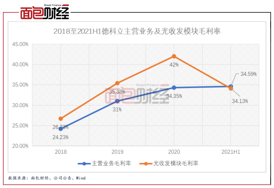 圖6:2018至2021H1德科立主營業(yè)務(wù)及光收發(fā)模塊毛利率
