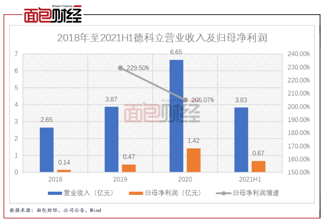 2019年和2020年德科立實(shí)現(xiàn)營業(yè)收入分別為3.87億元、6.65億元,同比分別增長46.17%、71.57%;實(shí)現(xiàn)歸母凈利潤分別為0.47億元、1.42億元,同比均增長2倍以上。2021上半年,公司實(shí)現(xiàn)營業(yè)收入3.83億元;實(shí)現(xiàn)歸母凈利潤6730.4萬元。