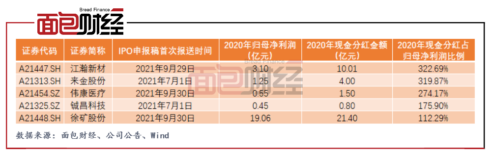 不僅僅是德科立,擬上市前的高比例分紅也成為大多數(shù)企業(yè)的選擇。以2021年下半年報送IPO申報稿的企業(yè)為例,據(jù)不完全統(tǒng)計,有5家企業(yè)在2020年的現(xiàn)金分紅金額占該年度歸母凈利潤的比例達(dá)100%以上。其中江瀚新材在2020年現(xiàn)金分紅逾10億元,占該年度歸母凈利潤的比例達(dá)3倍。