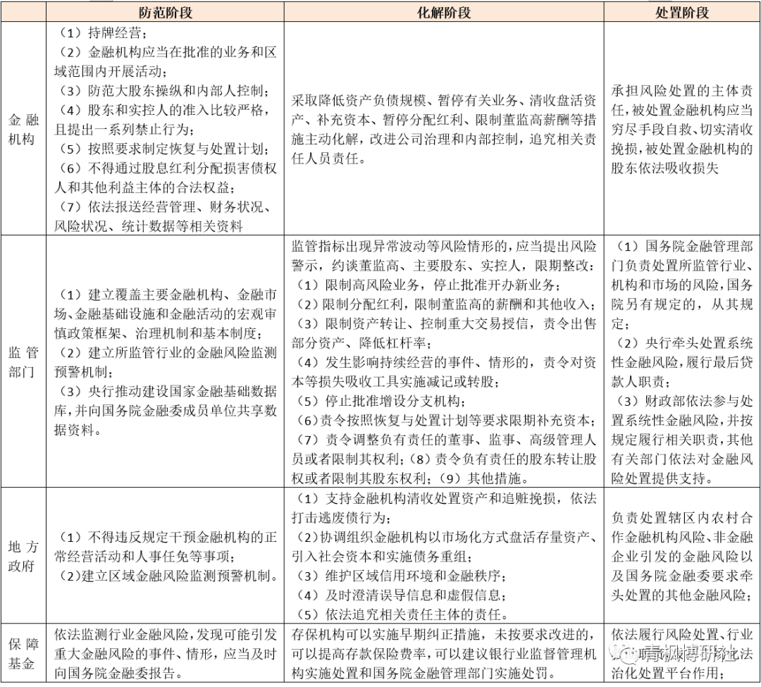金融穩定工作主要分為三個階段,即金融風險的事前防范、事中化解和事后處置階段。其中,每一個階段,《金融穩定法》均明確了金融機構及其主要股東、實控人,地方政府,監管部門以及存款保險基金、行業保障基金的職責。