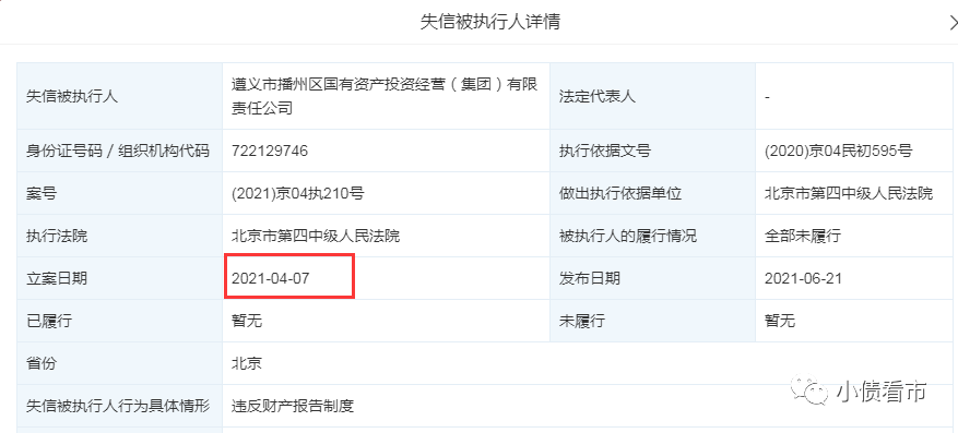 今年4月,由于與華融信托的糾紛,播州國投未履行法院裁定的給付義務,不僅被列為失信被執行人,還被采取限制消費措施。