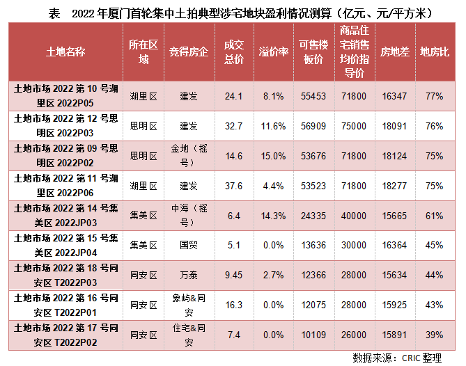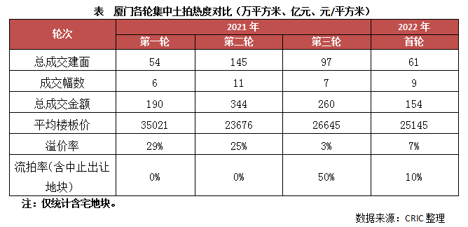 對比2021年第三輪集中土拍,廈門2022年首輪集中土拍熱度明顯上漲,整體溢價率高達7%,較去年第三輪明顯提升。