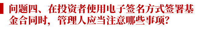 而在此需要提示管理人的是,最好充分評(píng)估電子簽約平臺(tái)的持續(xù)經(jīng)營(yíng)能力和在發(fā)生投資者爭(zhēng)議事件時(shí)的立場(chǎng),確保能夠在需要時(shí)獲得必要的協(xié)助。