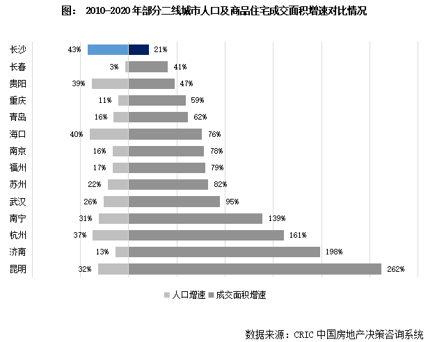 值得一提的是,與長沙強(qiáng)人口吸附力形成鮮明對比的是長沙樓市的不慍不火,具體來看,2010-2020年間長沙市人口增量超過300萬人,十年累計(jì)增速高達(dá)43%,在全國各熱點(diǎn)一二線城市中也位列靠前,我們統(tǒng)計(jì)了部分二線城市十年來人口增速及商品住宅成交面積增速發(fā)現(xiàn),長沙的人口高增長與其樓市表現(xiàn)存在嚴(yán)重背離,全市成交規(guī)模表現(xiàn)平穩(wěn),十年間僅增長了21%,較之部分省會(huì)城市如昆明、濟(jì)南、南寧等160%以上的增幅相差甚遠(yuǎn);與同處中部的重慶、武漢也有較大差距,樓市成長性較為滯后。