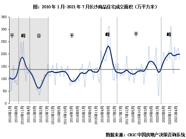 值得關(guān)注的是,2013年以后樓市進(jìn)入“政策化”,商品住宅成交規(guī)模逐年看穩(wěn)“穩(wěn)中有升”。告別“大漲大跌”時(shí)代后,得益于調(diào)控政策的逐漸完善全市購房需求有序釋放下,整體商品住宅成交呈現(xiàn)長期持穩(wěn)“平”周期與短期爆發(fā)“峰”周期相互交替的規(guī)模變化。尤其是2017年后隨著限購、限價(jià)、限售政策的層層收緊,“峰”周期內(nèi)波峰成交規(guī)模較2016年明顯壓降,整體市場規(guī)模更為平穩(wěn)。結(jié)合實(shí)際月度成交數(shù)據(jù)后,可見2013年后長沙樓市主要規(guī)模特征為:“平”與“峰”周期相交替,平穩(wěn)期持續(xù)時(shí)間大幅拉長至36個(gè)月以上,“峰”周期持續(xù)時(shí)間維持12個(gè)月左右不變。