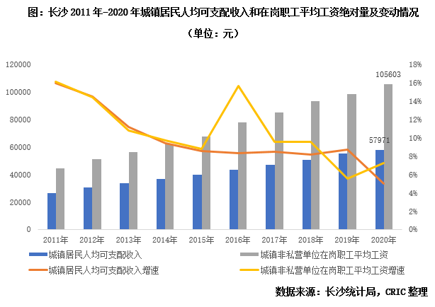 事實(shí)上,長沙居民收入一直保持相對充沛的水平,我們列示了長沙2011年以來城鎮(zhèn)居民人均可支配收入和在崗職工平均工資絕對量及變動(dòng)情況,可以看出,二者絕對量均保持正增長,截止2020年分別達(dá)到了5.8萬元和10.6萬元,增速呈波動(dòng)下行趨勢,至2019年末維持在5%-7%。