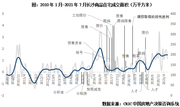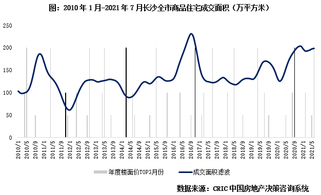 2016年后市場回歸理性,長沙樓市在盤整波動(dòng)中小幅上行。2017-2018年成交恢復(fù)往年水平,市場進(jìn)入盤整期,2018年中“625新政”調(diào)控升級,部分改善和炒房需求受到“重創(chuàng)”,市場開始緩步下行。直至2019年上半年才略有復(fù)蘇,下半年隨著二線城市成交熱度減退,購房者觀望情緒加重,市場略有降溫,2020年疫后高端住房需求被再次放大,疊加利好政策頻出“托市”,全年成交量再度踩上2000萬平方米。