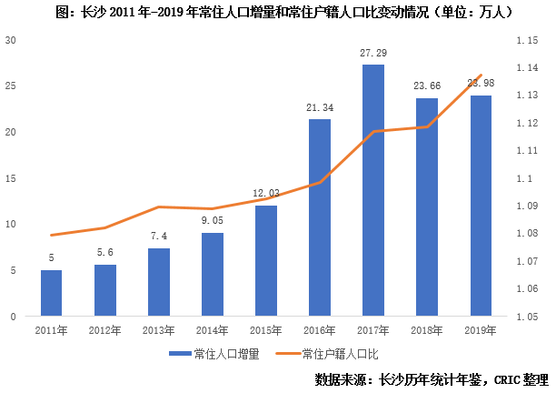 長沙樓市在疫情后迎來“復(fù)蘇”,調(diào)控“松動(dòng)”,地價(jià)攀升是直接導(dǎo)火線,而背后更深層次的原因則是長期積累購買力的集中爆發(fā)。縱觀長沙2011年以來常住人口增量變化,2011-2014年雖然逐年攀升,但每年增量均不足10萬人,而步入2015年以來常住人口增長明顯提速,每年增量均在25萬人左右,且常住戶籍人口比始終保持穩(wěn)中有增態(tài)勢,至2019年末已達(dá)1.14,保持人口凈流入。