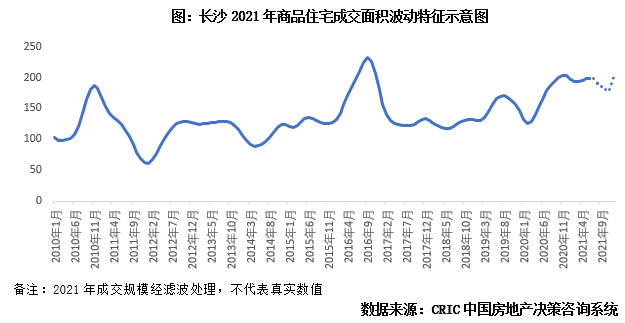 為了更好的預(yù)判1年之內(nèi)商品住宅成交面積的變動(dòng)量和上下行趨勢,首先依據(jù)上文得到的長沙短期樓市波動(dòng)的影響因素,2021年除法拍房精準(zhǔn)限購以來,并未出臺其他調(diào)控加碼措施,整體市場進(jìn)入了新的供求平衡期,預(yù)計(jì)7-10月將迎來小幅回調(diào),而參照歷史規(guī)律,11-12月有望“翹尾”回升,迎來年末的一次集中放量。