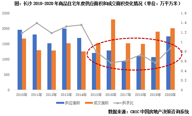 若要預(yù)判2021年全年總量,我們認(rèn)為還需結(jié)合商品住宅供應(yīng)等相關(guān)指標(biāo),一方面市場供應(yīng)和存量決定了成交的發(fā)揮空間,即成交的上限;另一方面,通過對比長沙歷年來商品住宅的供求面積,我們不難發(fā)現(xiàn),市場以2015年為分界點(diǎn),隨著供應(yīng)整體縮量,市場逐步由供過于求向供不應(yīng)求轉(zhuǎn)變,且年供求比基本保持在0.6-0.9之間波動(dòng),值得關(guān)注的是,2002年供應(yīng)顯著放量的情況下,供求差值也有縮小的趨勢,供求比維持在0.87,因而可以將商品住宅供應(yīng)量作為判斷短期(1年內(nèi))成交是否放量的重要依據(jù)。