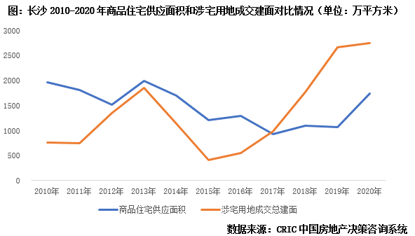 若要預(yù)判長沙商品住宅供應(yīng)量,我們還需聚焦長沙土地市場,從下圖中可以看出,長沙涉宅用地成交規(guī)模是商品住宅供應(yīng)面積的先行指標(biāo),按照房企拿地到項(xiàng)目入市1-2年的開發(fā)周期來推算,2010-2015年涉宅用地成交規(guī)模呈現(xiàn)出波動(dòng)下行趨勢也導(dǎo)致2012-2017年整體商品住宅供應(yīng)面積呈現(xiàn)出穩(wěn)步下行趨勢,而自2016年以來整體涉宅用地成交規(guī)模由降轉(zhuǎn)增也帶動(dòng)了2018年以來商品住宅供應(yīng)面積的穩(wěn)步回升。