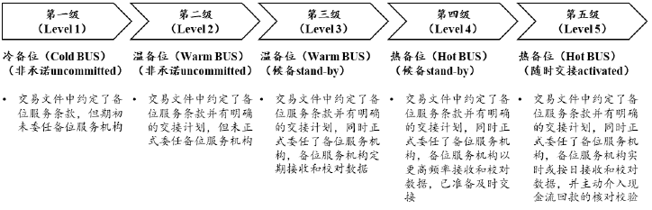 國際證券化市場參照信息科技學中的專業(yè)術(shù)語,根據(jù)服務商的接替工作準備到位程度(Readiness)的不同,把“備位服務”進一步區(qū)分為“熱備位(Hot BUS)、溫備位(Warm BUS)、冷備位(Cold BUS)”,具體含義如下: