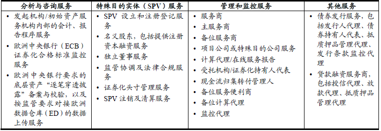 “備位服務”作為資產(chǎn)證券化運營風險管理的重要一環(huán),防范的是初始資產(chǎn)服務機構(gòu)經(jīng)營不善、破產(chǎn)等原因?qū)е沦Y產(chǎn)服務中斷的極端風險。雖然發(fā)生的概率極低,但一旦發(fā)生,影響極大,所以越來越引起市場參與者的重視。不過正是由于發(fā)生的概率極低,“備位服務”很難獨立成為一種商業(yè)模式。國際證券化市場中,備位服務機構(gòu)同時也是資產(chǎn)服務機構(gòu),另外也提供其他相關(guān)的證券化服務。以意大利證券化綜合服務商Securitisation Services公司為例,其2001年起成為證券化服務商,如今提供證券化“一站式”(One-stop-shop)綜合服務,詳見下表四,涵蓋多種服務范圍,管理資產(chǎn)規(guī)模超過2,950億歐元,服務證券化交易超過360單,涉及1040多個角色、超過15個資產(chǎn)類別、250多家SPV,公司人數(shù)超過155人。2007年首次獲得標普服務商評級“強(Strong)”級別,2012年起至2020年連續(xù)多年獲得標普服務商多項評級“強(Strong)”級別,包括意大利ABS主服務商、RMBS和CMBS主服務商綜合評級、公司管理和組織架構(gòu)單項評級、資產(chǎn)管理能力單項評級均為“強(Strong)”級別,展望“穩(wěn)定(Stable)” ④,成為歐洲市場領(lǐng)先的資產(chǎn)服務商和備位服務機構(gòu)。
