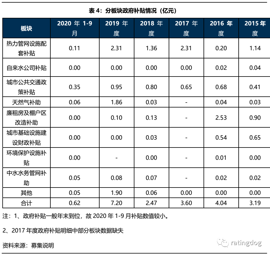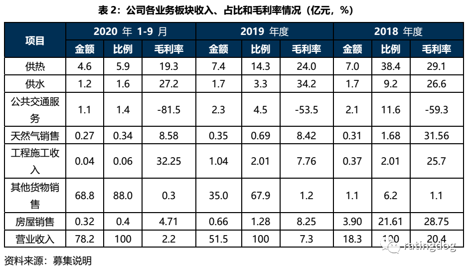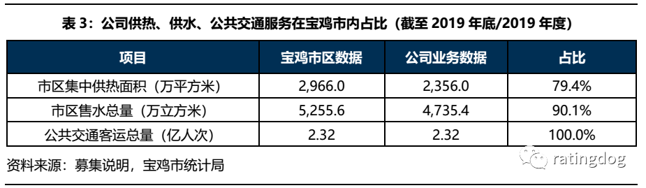 公司供熱業務主要包括寶雞城市集中供熱的規劃建設和冬季供熱、夏季制冷、生活熱水供應及發電,是公司主要的營收與利潤來源;公司供水業務主要為自來水供應外加中水處理業務,收入較為穩定,盈利能力尚可;公司的公共交通服務主要為市區內居民出行的客運服務,盈利能力較弱,近兩年又一期的利潤均為負。從表3可以看到,在寶雞市區內,公司集中供熱面積區域內占比79.4%,售水量占比90.1%,而公共交通客運總量占比更是達到了100%,公司在寶雞市的供熱、供水以及公共交通服務業務等城市公用事業領域里已接近壟斷地位。