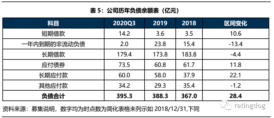 雖然公司最新的募集說明書里沒有披露有息債務的明細,但根據公司2018、2020年度第一期中票募集說明書中可知,截至2017年底,公司的280.2億元有息債務均來自于銀行借款(221.4億元)與債券融資(58.8億元),而截至2019年底,公司非標融資余額僅5億元,結合表5里近兩年又一期公司有息債務規模結構并未發生大幅變化,可以推斷截至2020年9月末,公司有息債務來源主要為銀行借款與債券融資,非標融資占比較低。