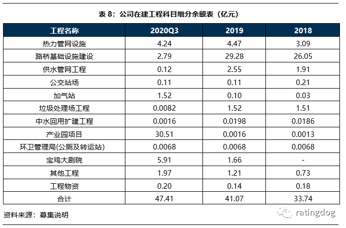 從動態角度看,2018年末至2020年9月末,公司新增資產主要為存貨(21.1億元)與在建工程(13.7億元),其中存貨增加主要來源于棚戶區改造項目投資逐年增加形成的開發成本,在建工程增加主要來源于公司對集中供熱管網工程項目、產業園項目和寶雞大劇院的投資。