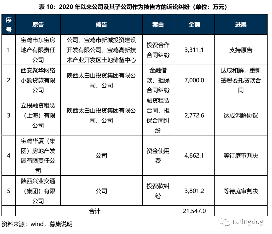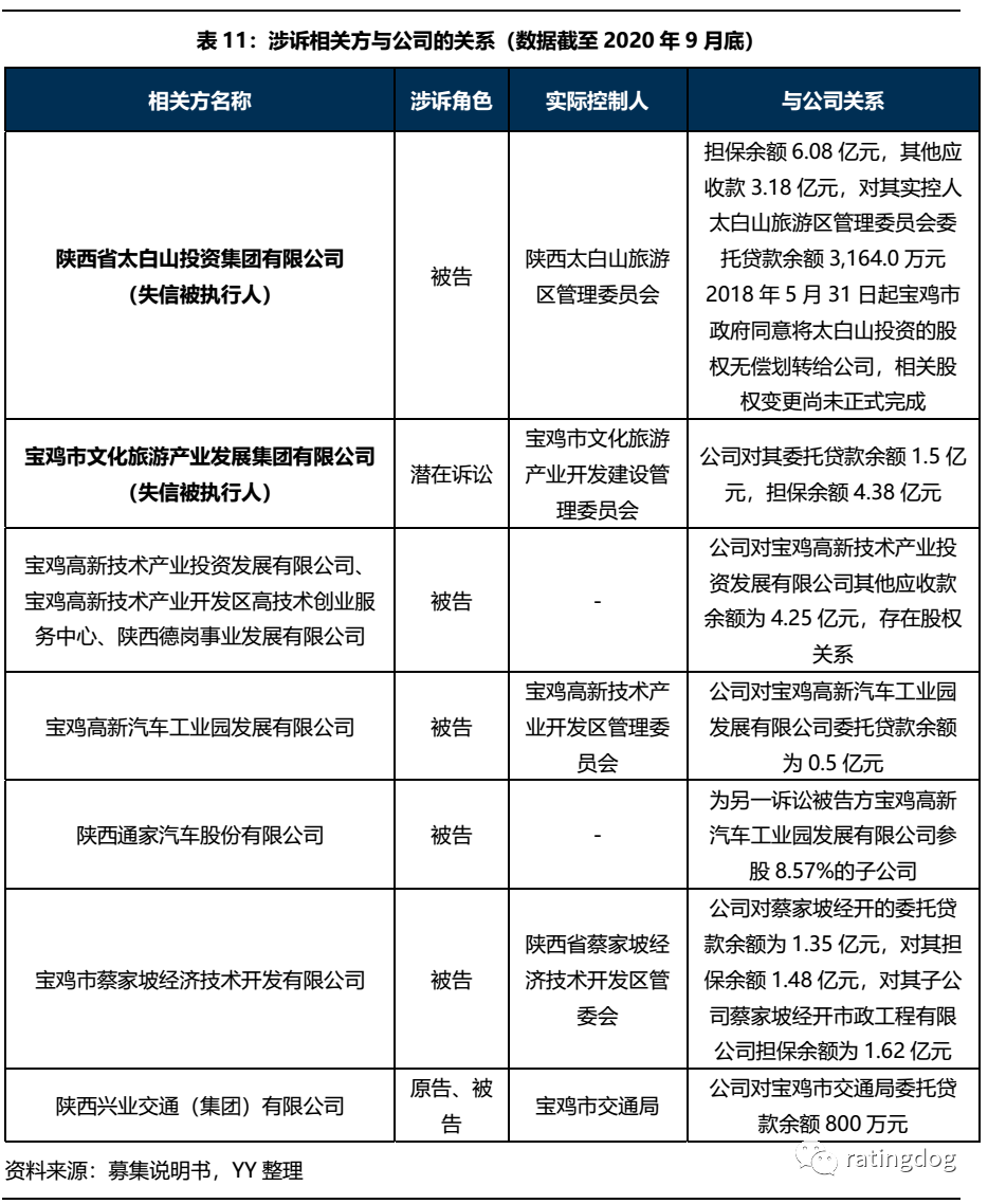 除上表所列案件以外,截至2020年9月末,公司對寶雞市文化旅游產業發展集團有限公司(簡稱“寶雞文旅”)的擔保余額為4.375億元,其中與陜西省國際信托股份有限公司(簡稱“陜國投”)的債務為2.5億元,部分已到期,寶雞文旅正在與陜國投協商。