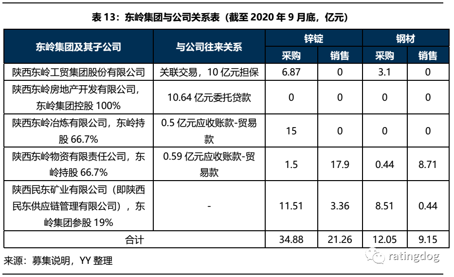 作為寶雞投對外擔保中唯一的民企,陜西東嶺工貿集團股份有限公司(簡稱“東嶺集團”)顯得更加引人注目。在挖掘更多信息后可以看到,東嶺集團與寶雞投的關系并不僅僅是10億元的對外擔保,截至2020年9月末,寶雞投還對東嶺集團子公司有規模較大的委托貸款(10.64億元)與應收賬款余額(1.09億元),以及存在大量的貨物采購銷售業務。